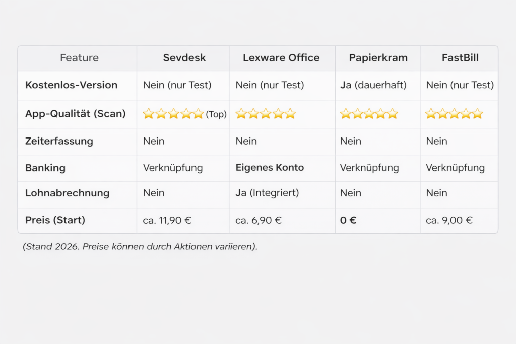 Ja, aber nur eine in diesem Vergleich. Papierkram bietet eine „Free“-Version an, die zeitlich unbegrenzt ist und für den Start reicht. Alle anderen Anbieter (Sevdesk, Lexware, FastBill) bieten lediglich kostenlose Testphasen (meist 14 bis 30 Tage) an. Danach musst du ein Abo abschließen, um weiterarbeiten zu können.